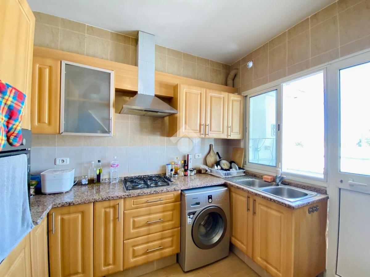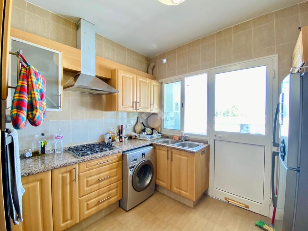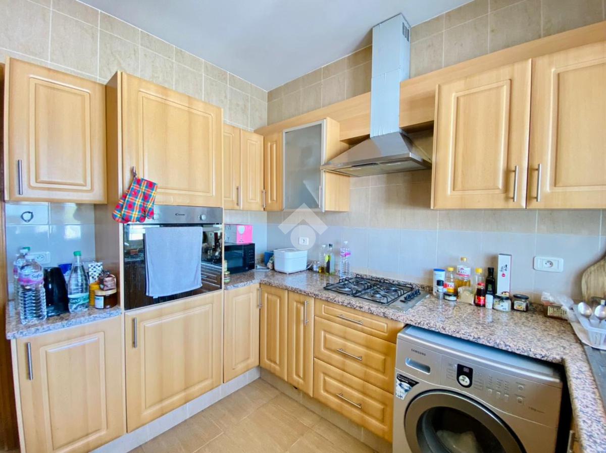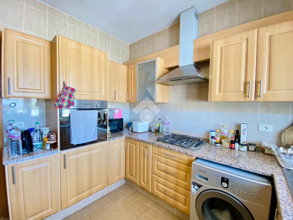 La cuisine, bien aménagée, est entièrement équipée : réfrigérateur, plaque de cuisson, four électrique, hotte aspirante et tous les ustensiles nécessaires. Elle s’ouvre sur un séchoir pratique.